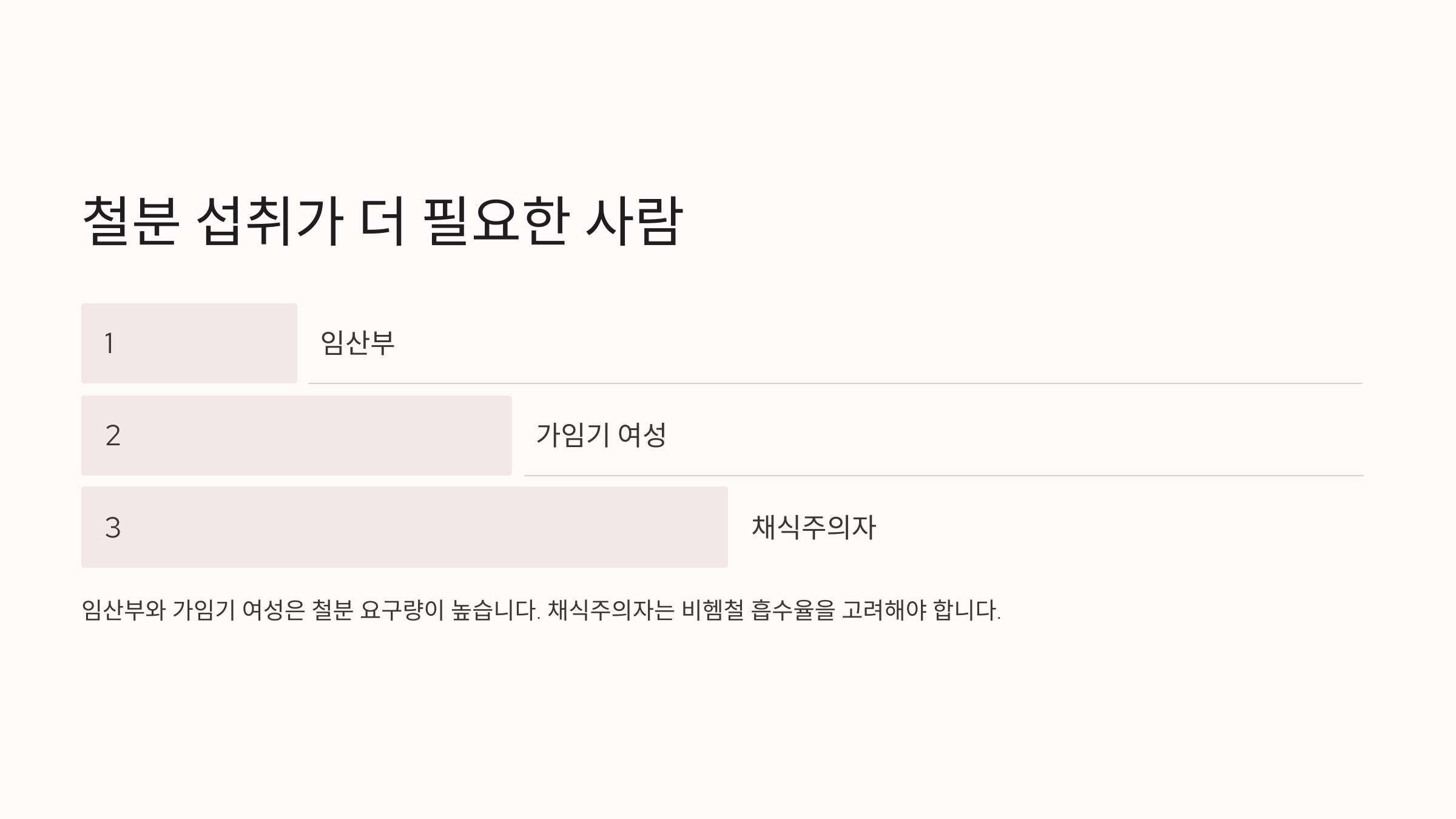 • ✔️ 가임기 여성 (생리로 인해 철분 손실 증가)