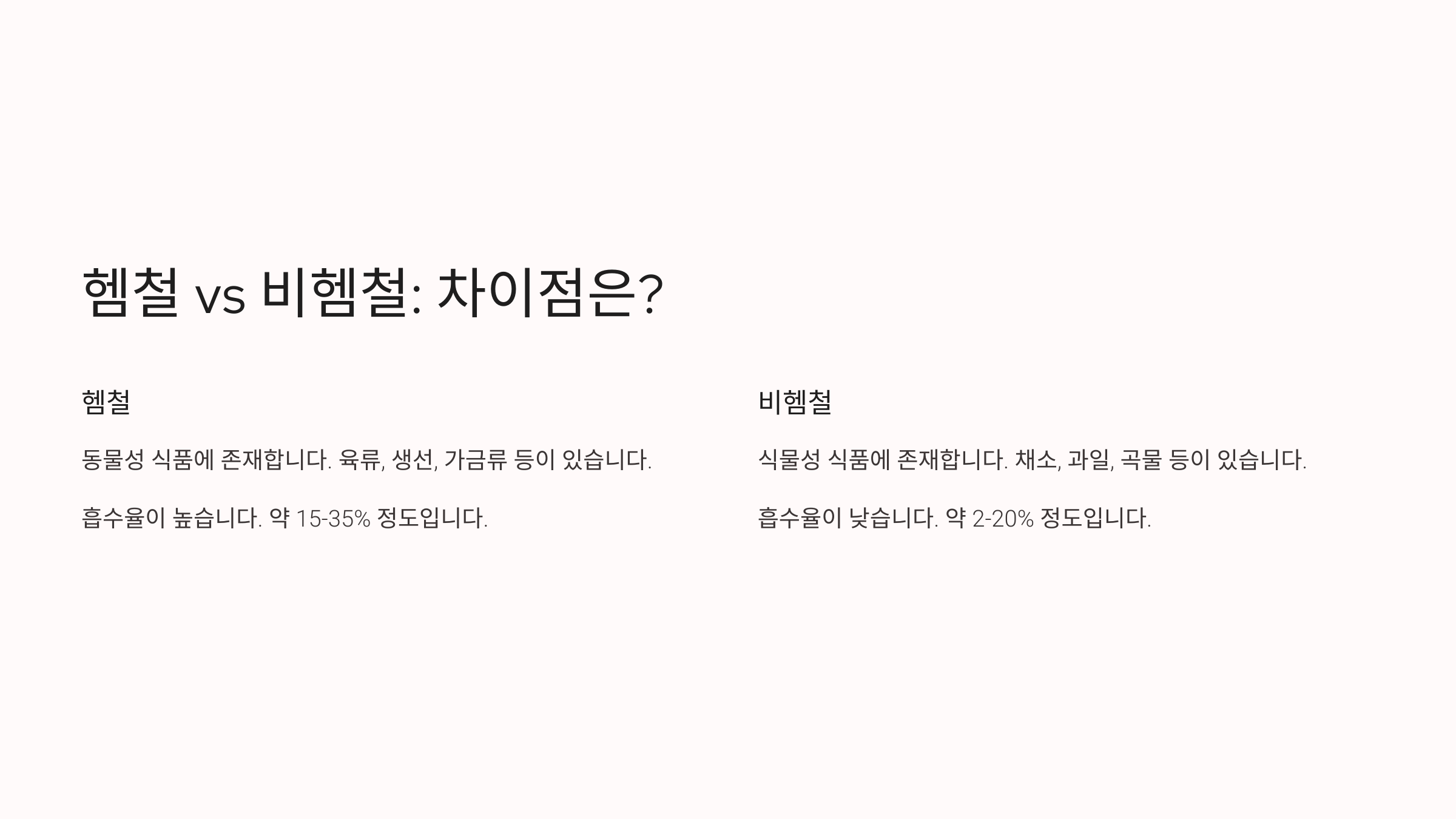 | 구분 | 헴철 (Heme Iron) | 비헴철 (Non-Heme Iron) |