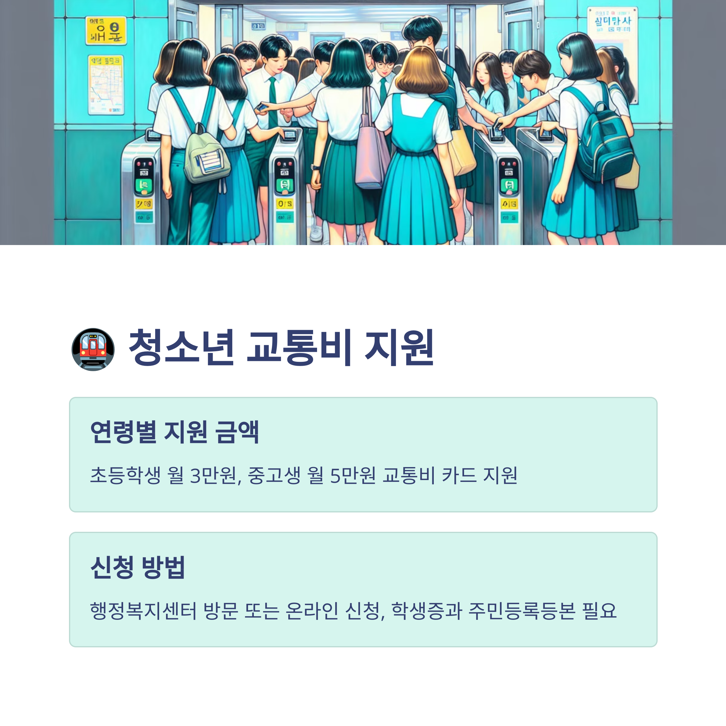 📌 청소년 교통비 지원은 해당 지역 교통카드로 지급되며, 버스·지하철에서 사용할 수 있어요!