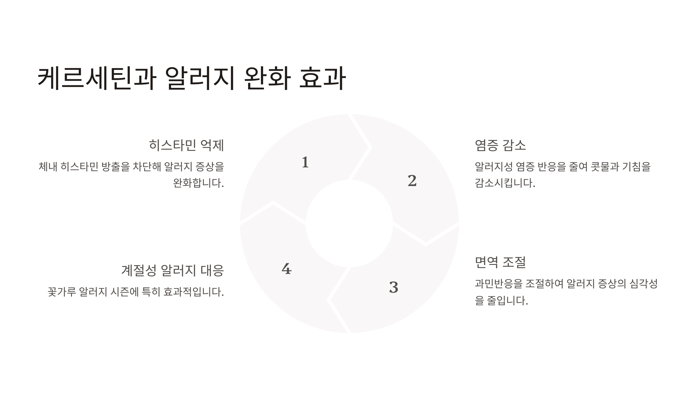 | 히스타민 억제 | 비만세포에서 히스타민 분비를 줄여 알러지 증상 완화 |