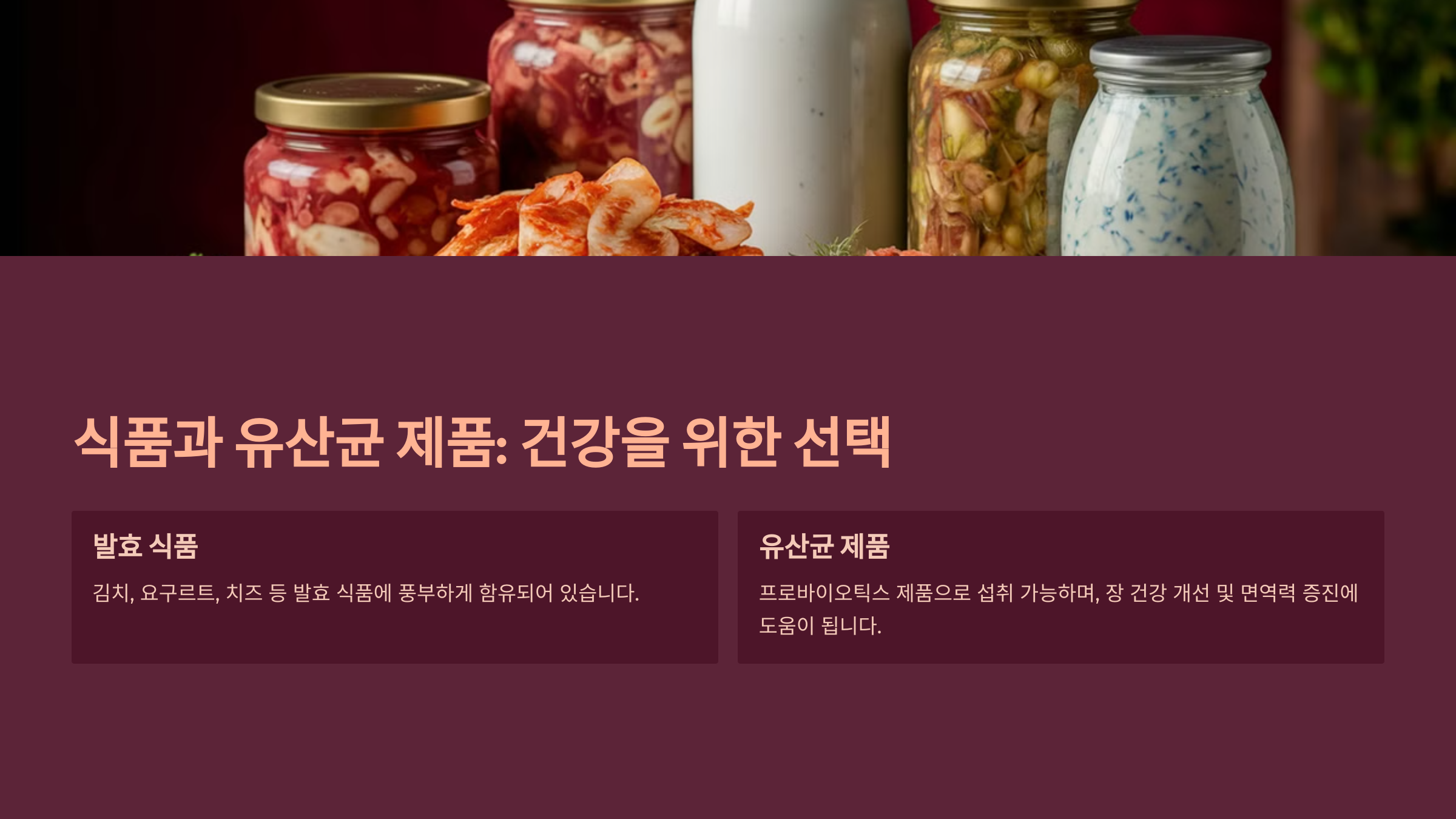 | 유산균 제품 | 프로바이오틱스 보충제로 섭취하여 장 건강과 면역력 강화 |