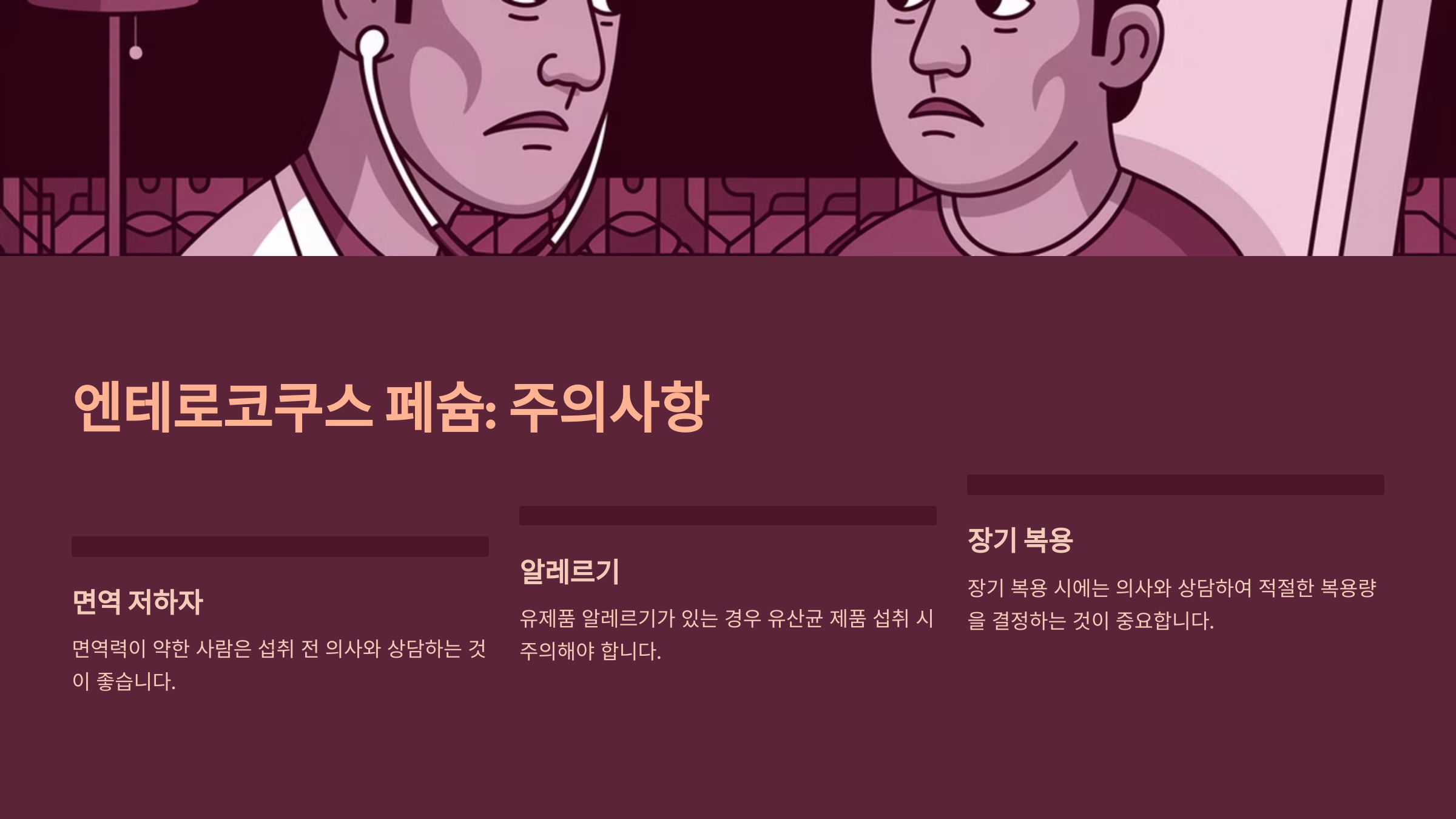 👇 다음 섹션에서는 엔테로코쿠스 페슘의 부작용과 주의사항에 대해 알아볼게요!