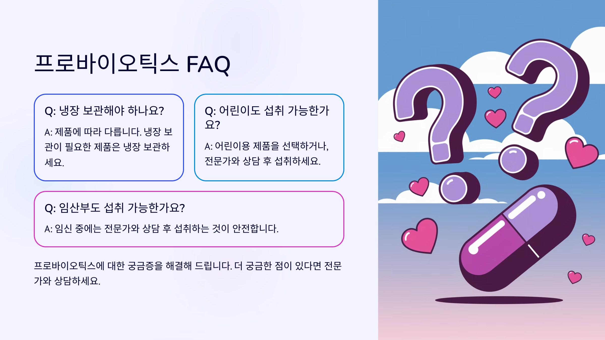 프로바이오틱스는 대체로 안전하지만, 일부 사람들에게는 부작용이 발생할 수도 있어요. 특히 처음 복용하거나 특정 질환이 있는 경우에는 주의해야 해요!