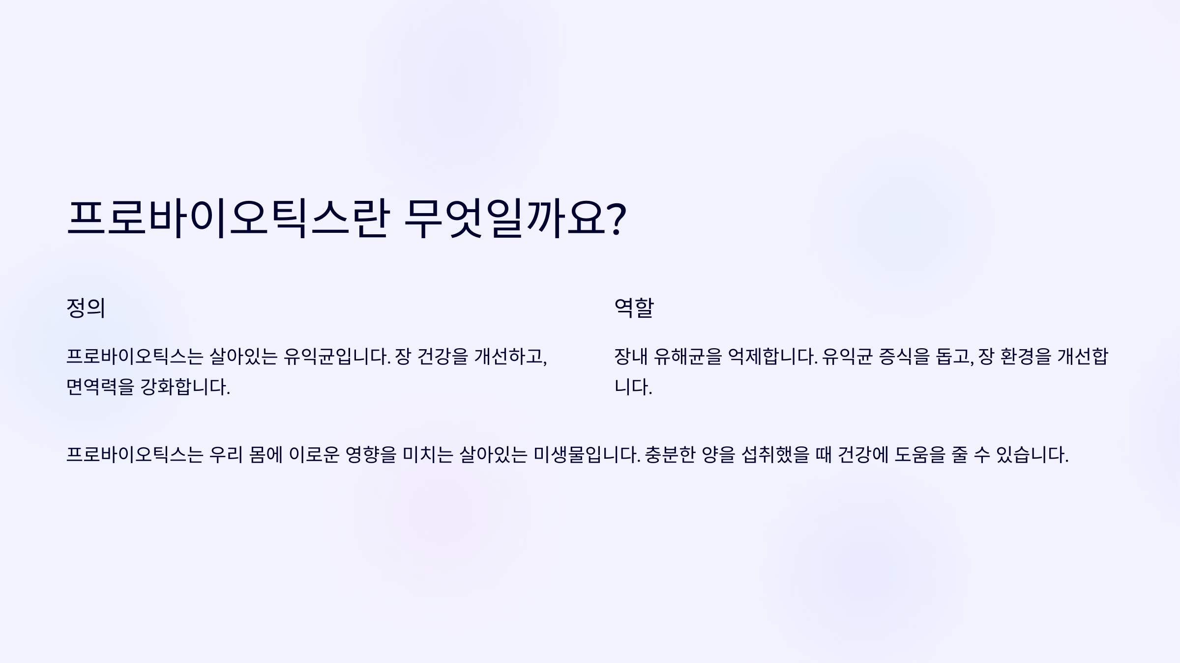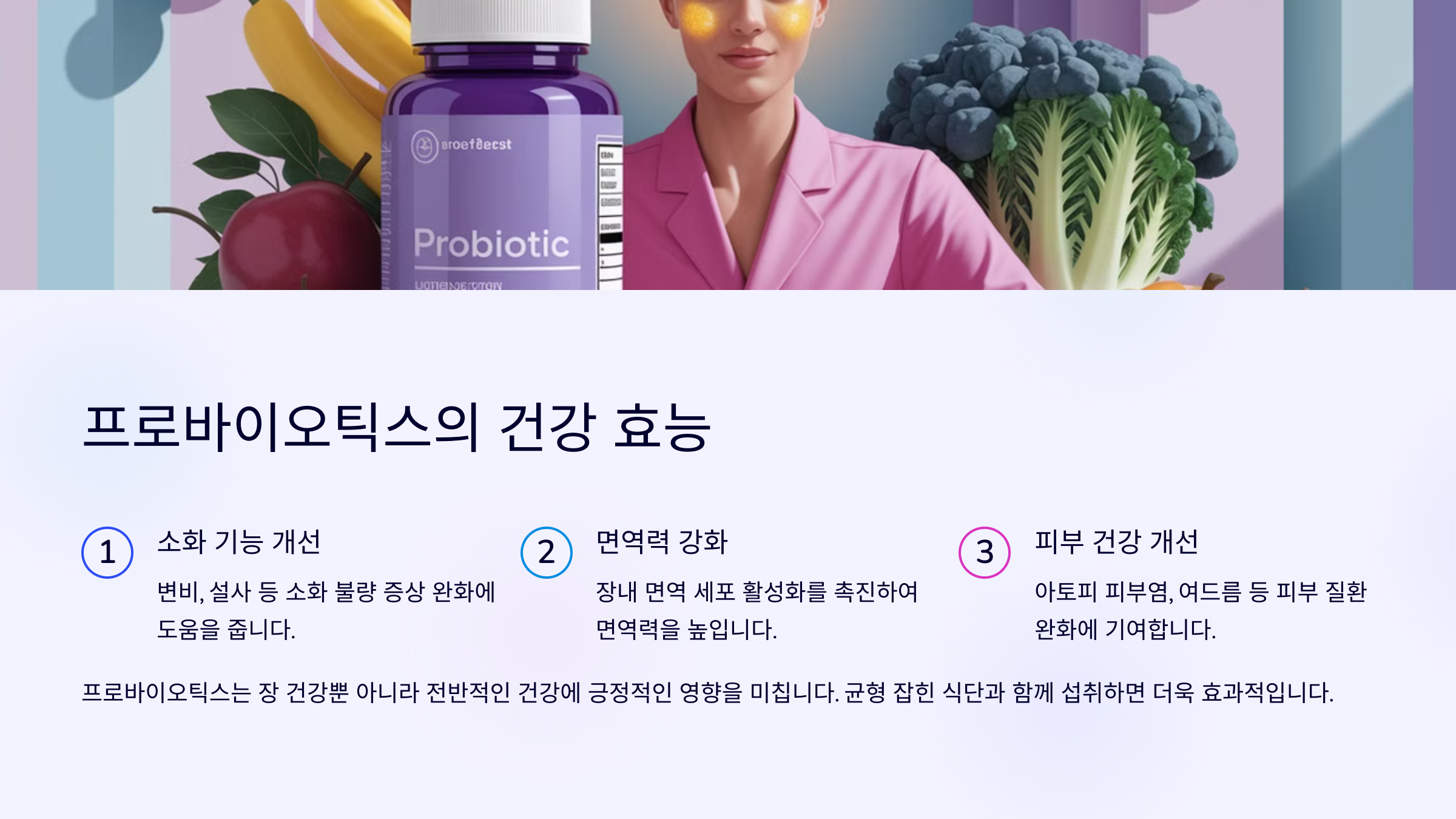 즉, 프로바이오틱스는 단순히 장 건강뿐만 아니라 몸 전체의 건강을 관리하는 데 중요한 역할을 해요.