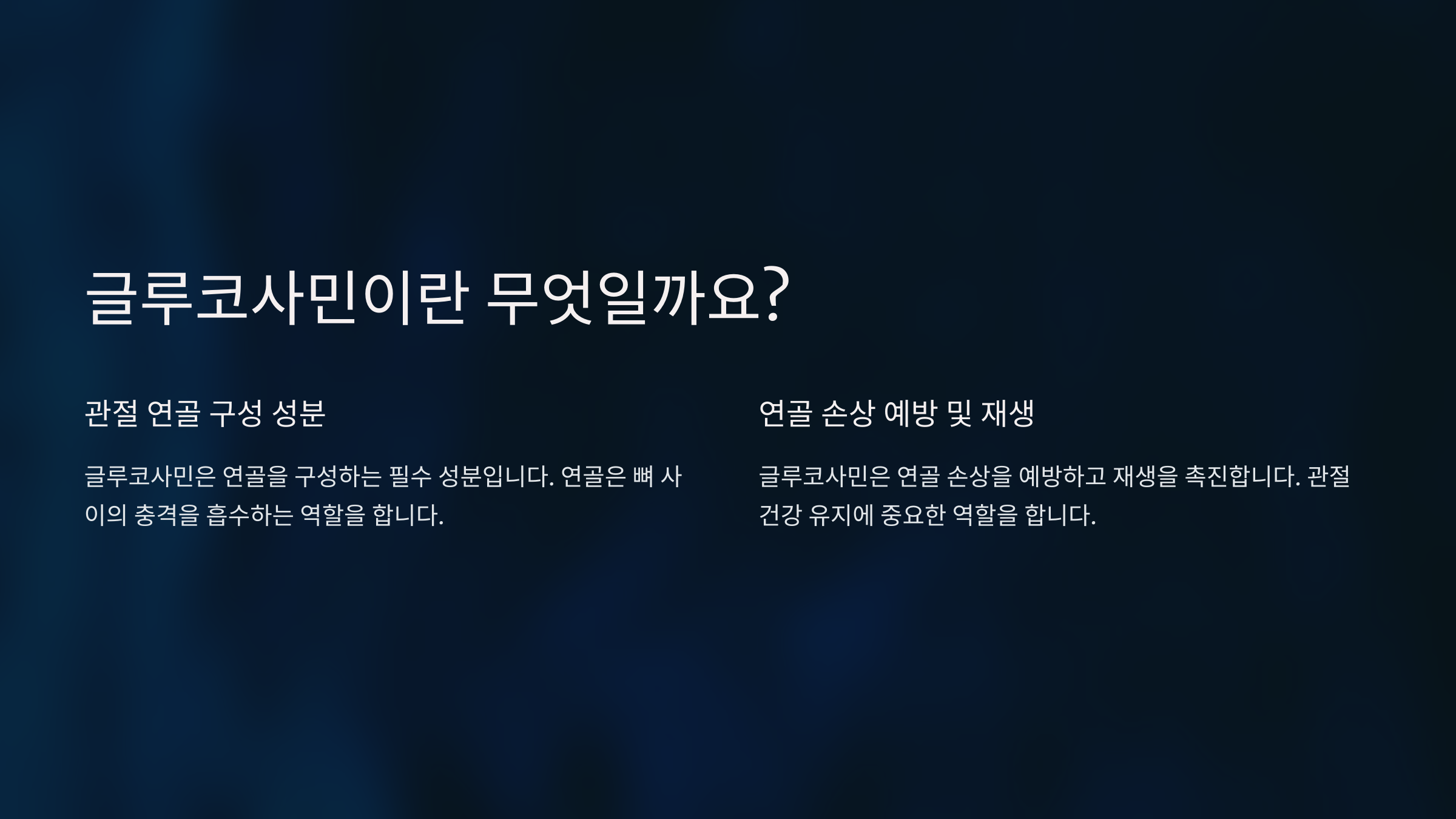| 주요 기능 | 연골 생성 촉진, 관절 윤활 | 연골 보호, 수분 유지 |
