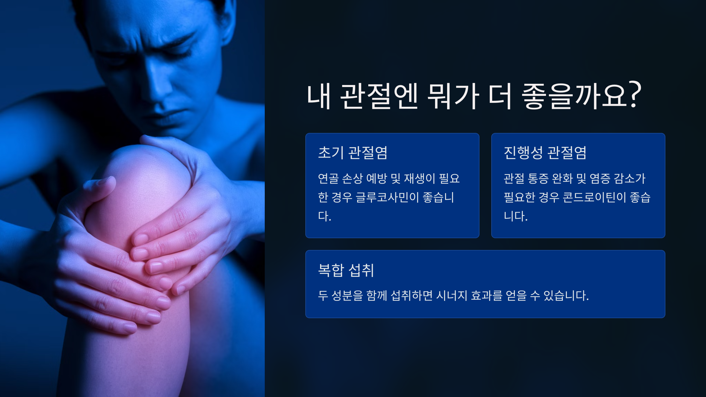 | 추천 대상 | 관절 건강 유지, 초기 관절 통증 | 관절 손상이 진행된 경우 |