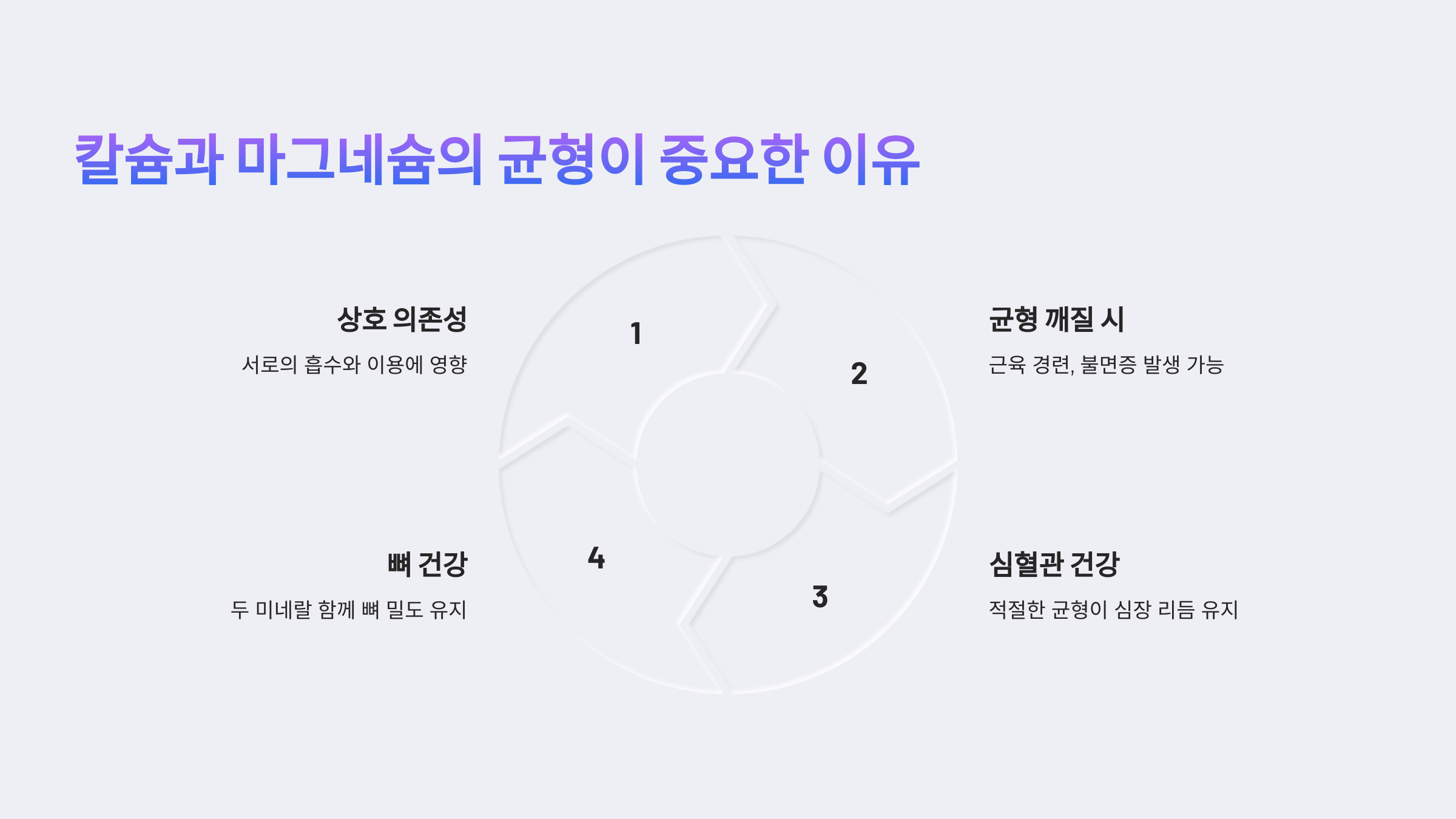 칼슘과 마그네슘은 **서로 반대되는 작용을 하는 미네랄**이에요. 칼슘은 **근육을 수축**시키고, 마그네슘은 **근육을 이완**시키죠. 이 균형이 깨지면 다양한 문제가 발생할 수 있어요. ⚠️