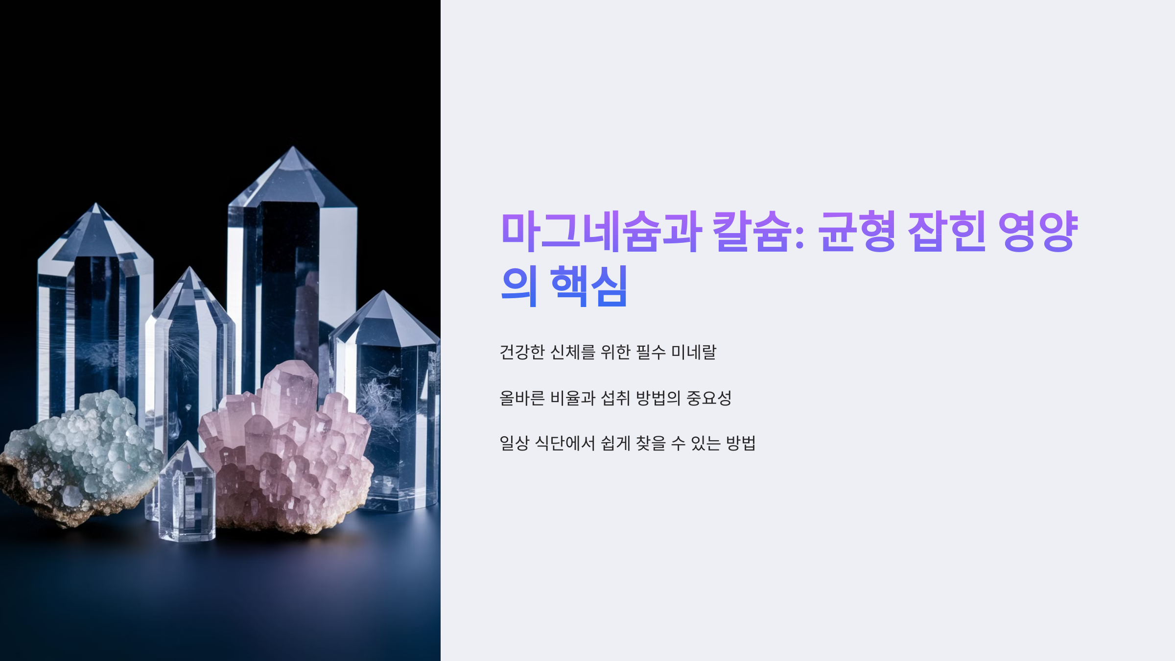 마그네슘과 칼슘은 건강에 필수적인 미네랄이에요. 특히 **뼈 건강, 근육 기능, 신경 전달**에 중요한 역할을 하죠. 🦴