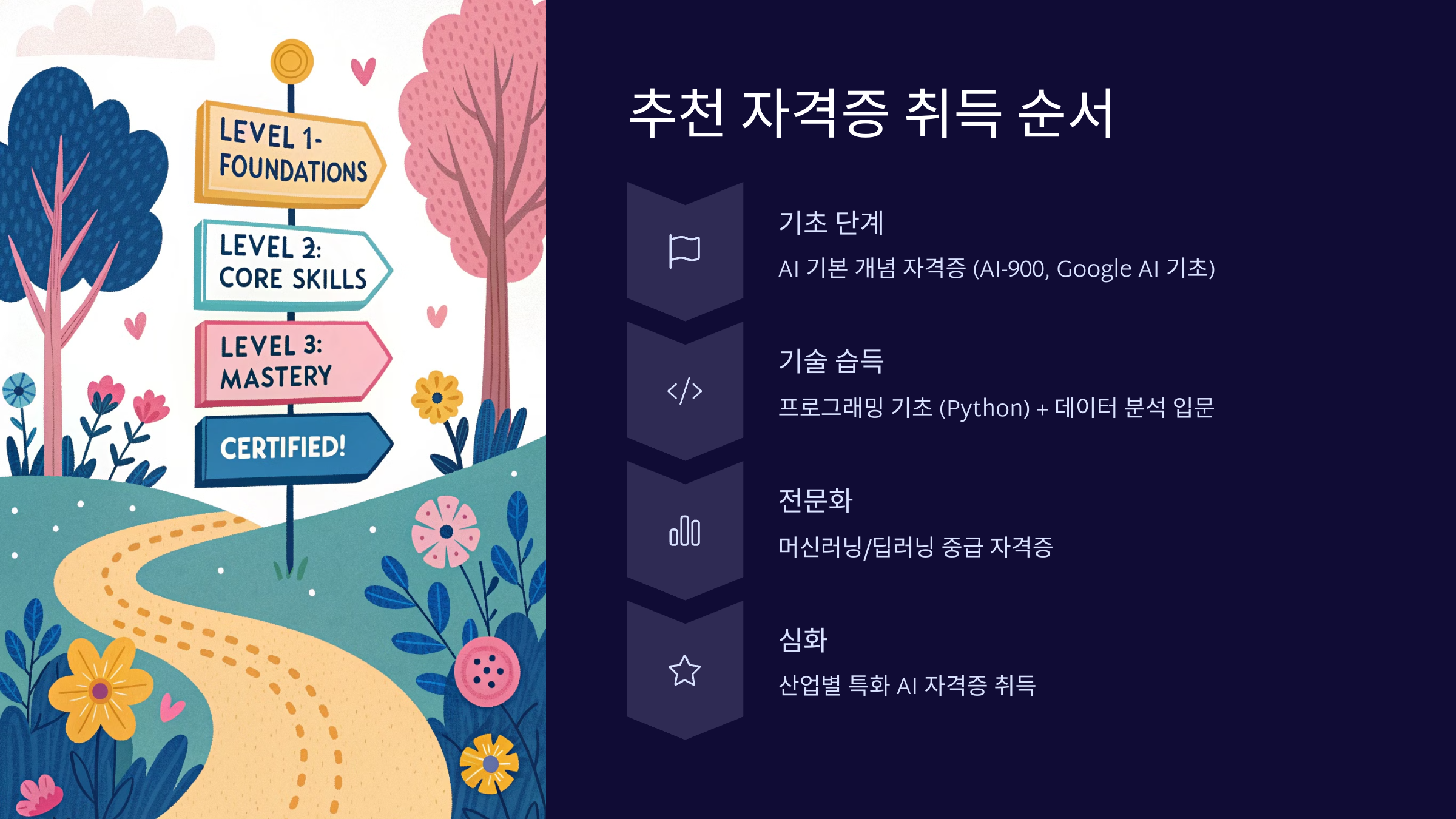 비전공자가 AI 자격증을 준비할 땐 “쉬운 것부터 → 실무형 → 응용” 단계로 순서를 정하는 게 좋아요.