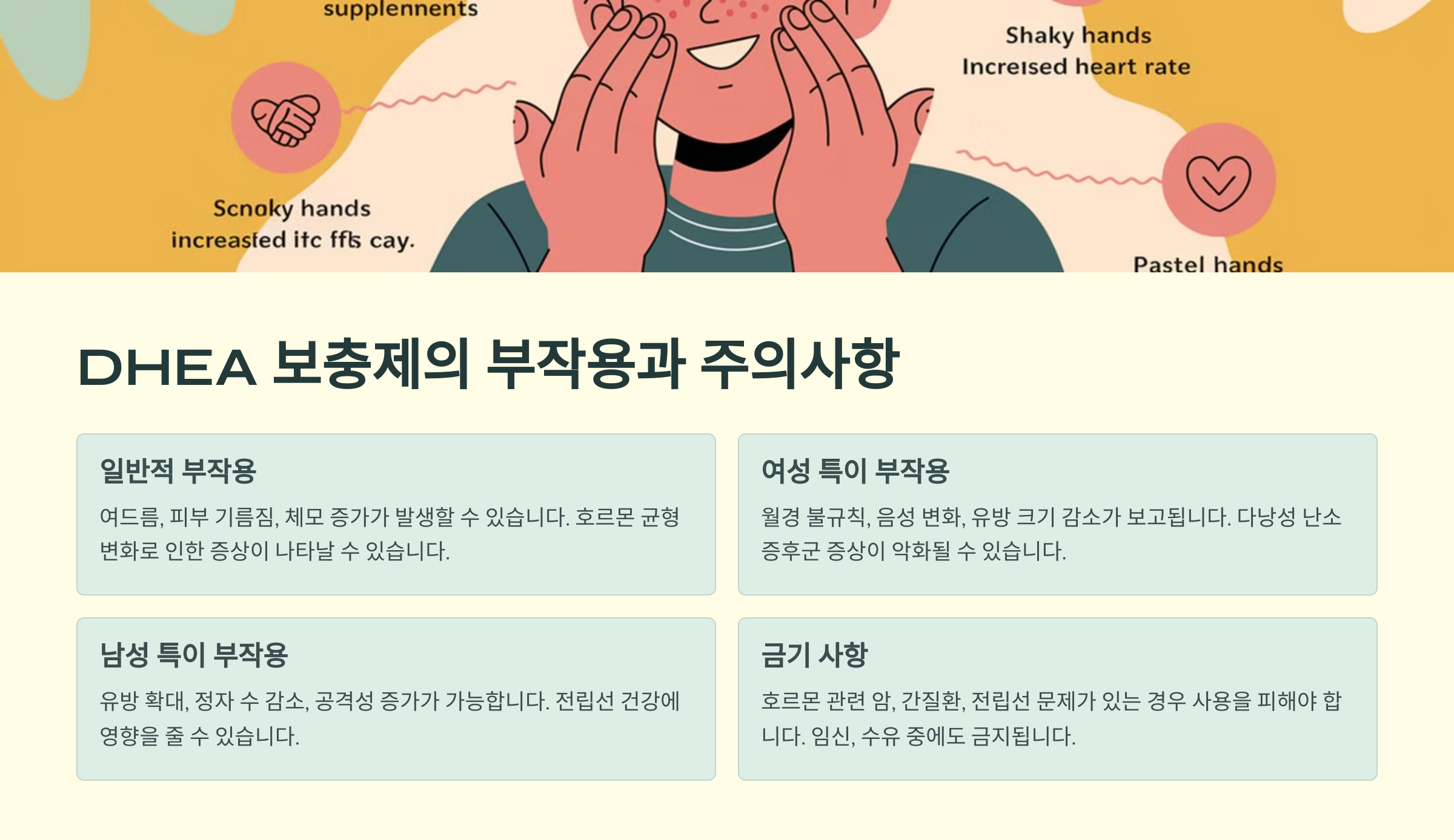 DHEA 보충제는 부작용이 발생할 수도 있어요. 특히 과다 복용하면 호르몬 균형이 깨질 수 있으니 주의해야 해요.