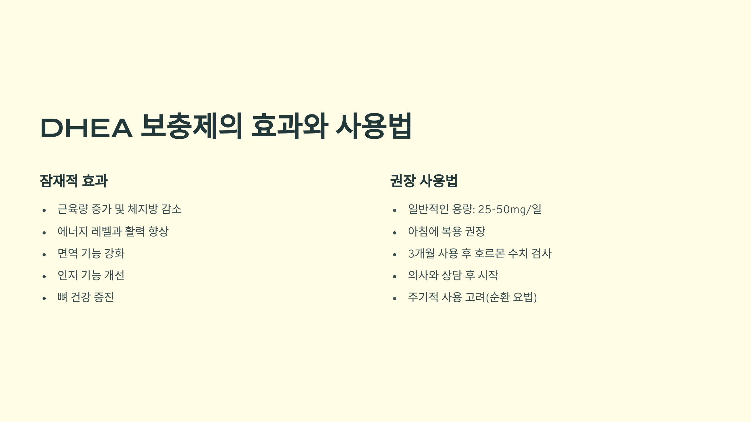 DHEA 보충제가 건강에 미치는 긍정적인 효과와 주의해야 할 부작용을 정리해 볼게요. 😊