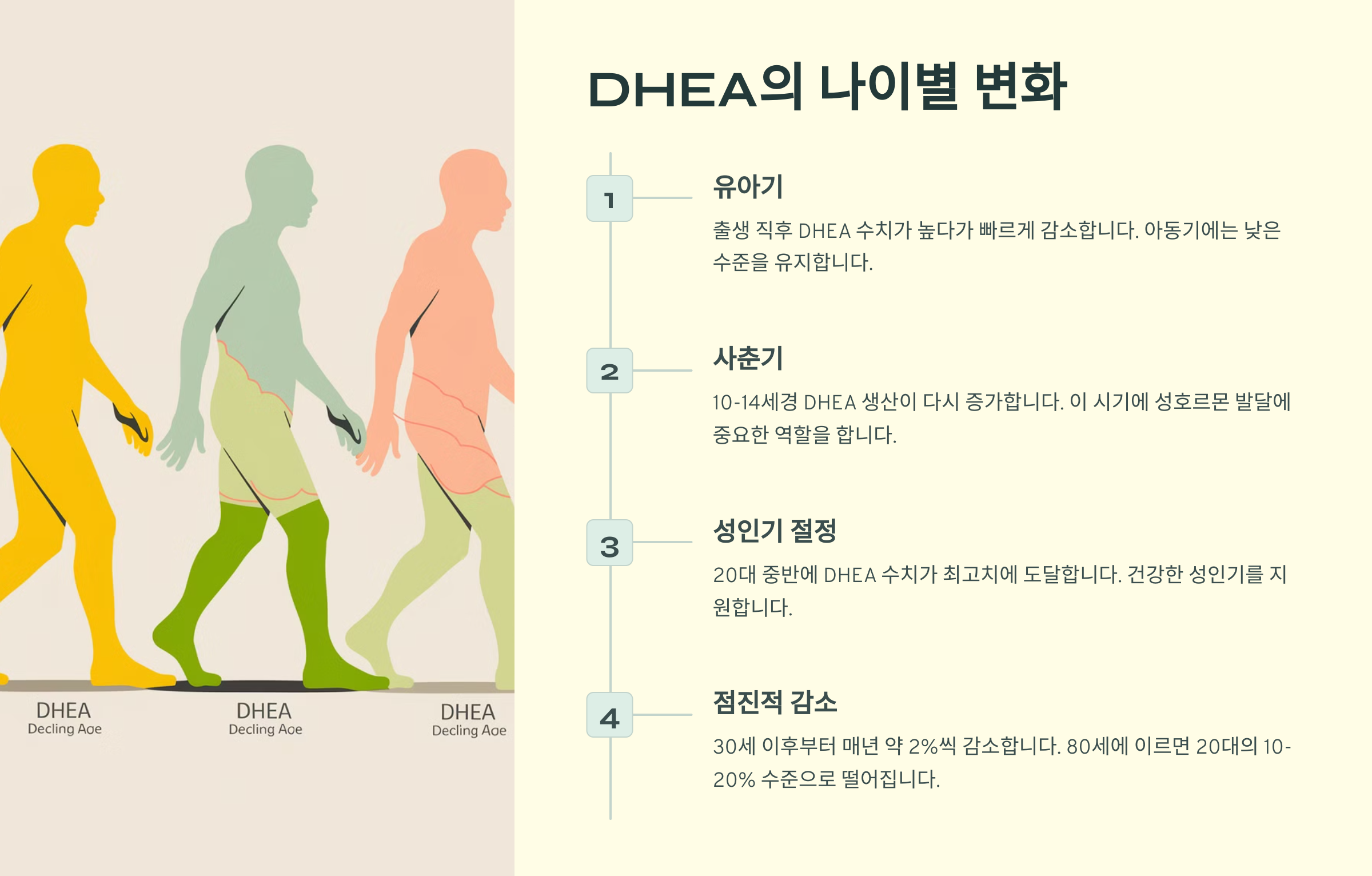 이처럼 DHEA는 단순한 호르몬이 아니라, 우리 몸 전체의 건강에 영향을 미치는 중요한 요소예요. 하지만 이 수치는 나이에 따라 크게 변할 수 있어요. 다음 섹션에서 나이에 따른 DHEA 변화에 대해 알아볼게요! 🧐