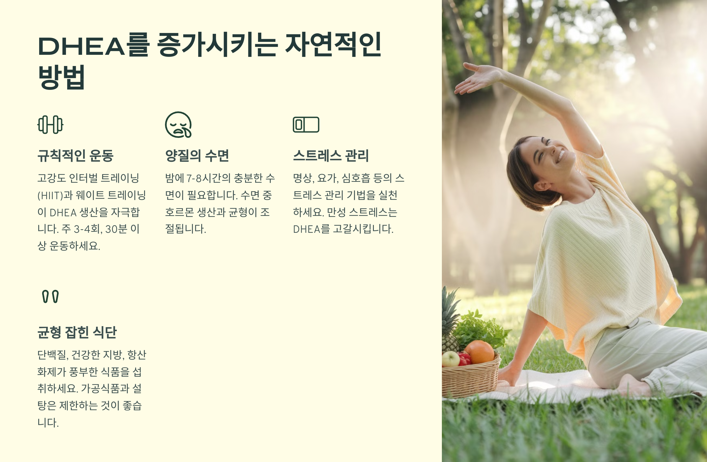 | 스트레스 관리 | 요가, 명상, 심호흡 등을 실천하면 코르티솔 수치를 낮춰 DHEA 감소를 방지할 수 있어요. |