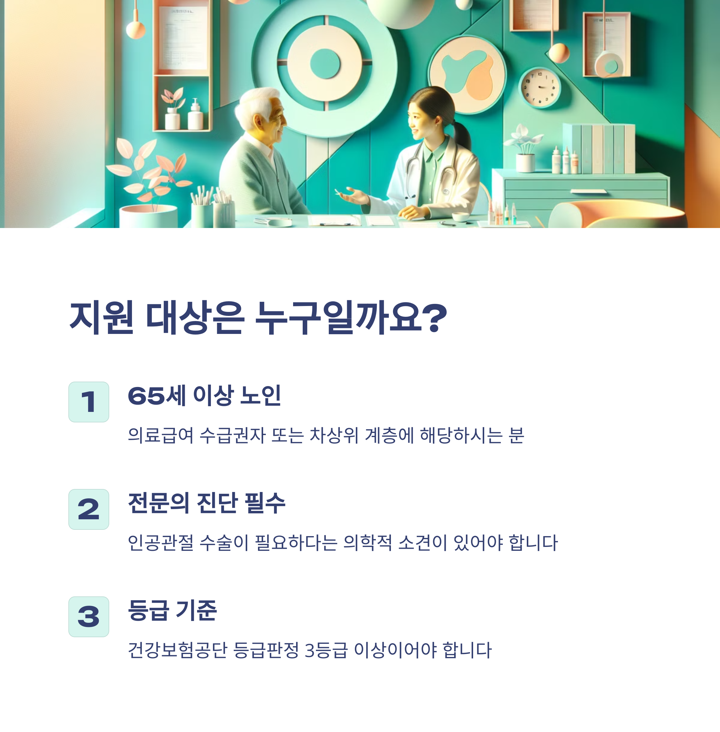 또한, 단순히 나이만으로 지원받을 수 있는 것이 아니라, 의료적인 기준도 충족해야 해요. 무릎 관절염이 심각하여 수술이 반드시 필요한 경우에만 지원이 가능해요.
