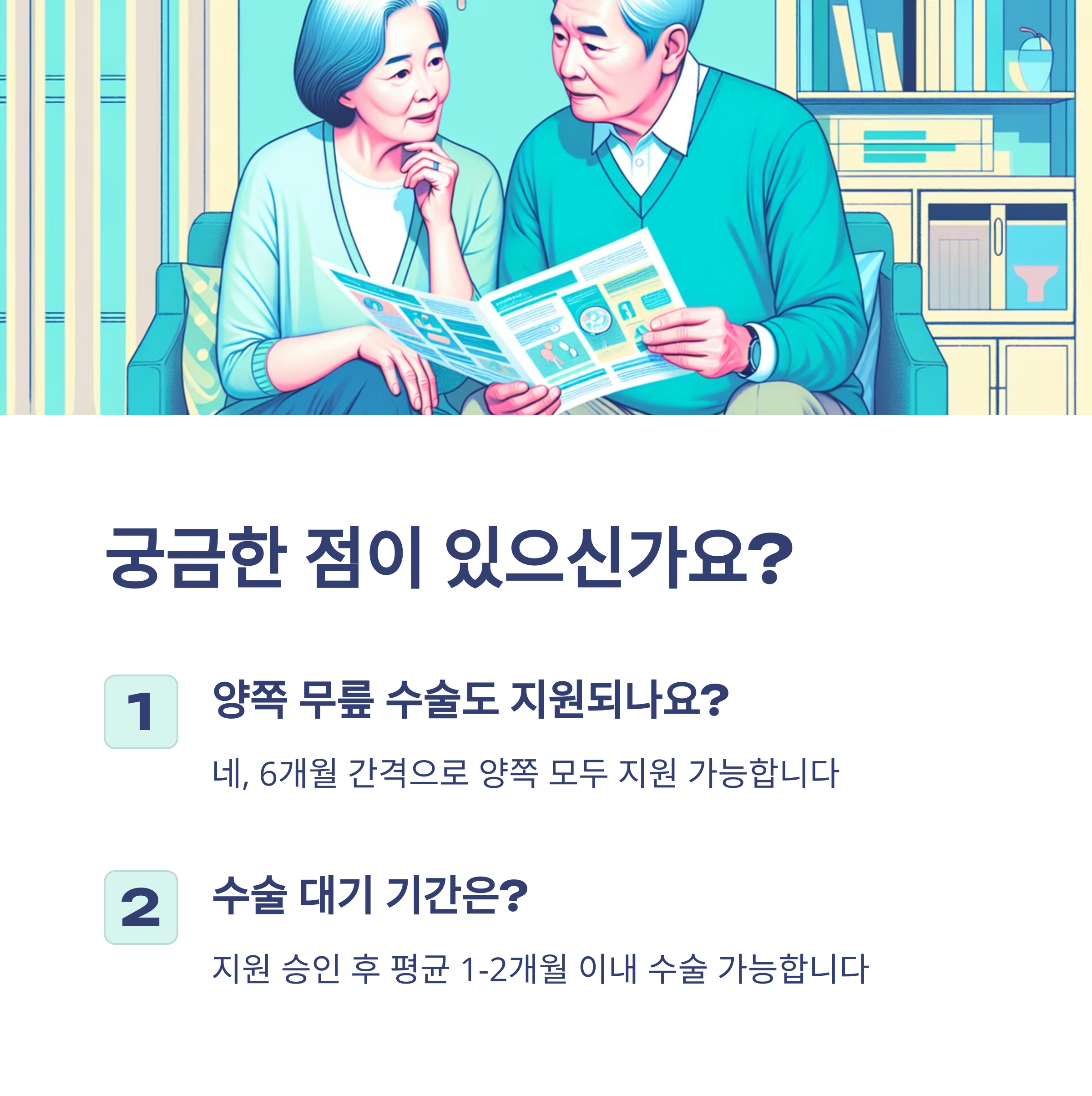 또한, 단순히 나이만으로 지원받을 수 있는 것이 아니라, 의료적인 기준도 충족해야 해요. 무릎 관절염이 심각하여 수술이 반드시 필요한 경우에만 지원이 가능해요.
