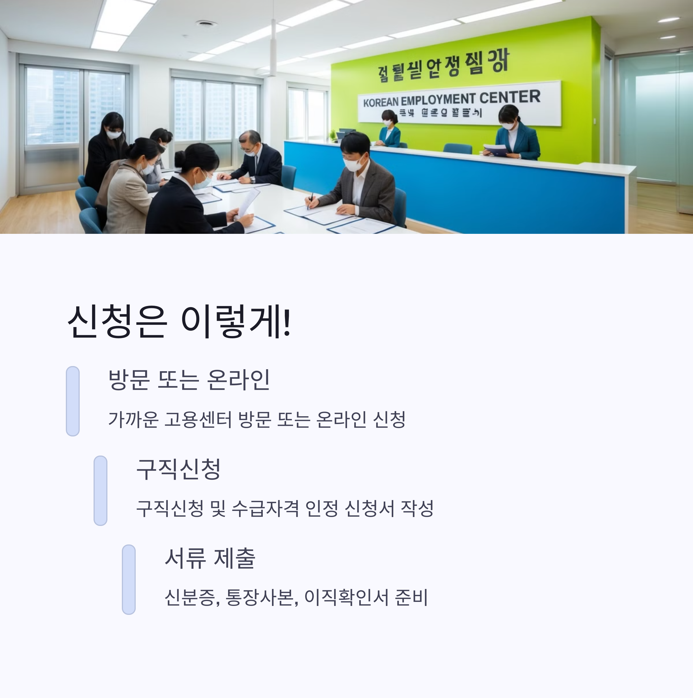 | 3단계 | 고용센터 방문 및 신청서 제출 | 주민등록증, 통장사본, 이직확인서 등 |