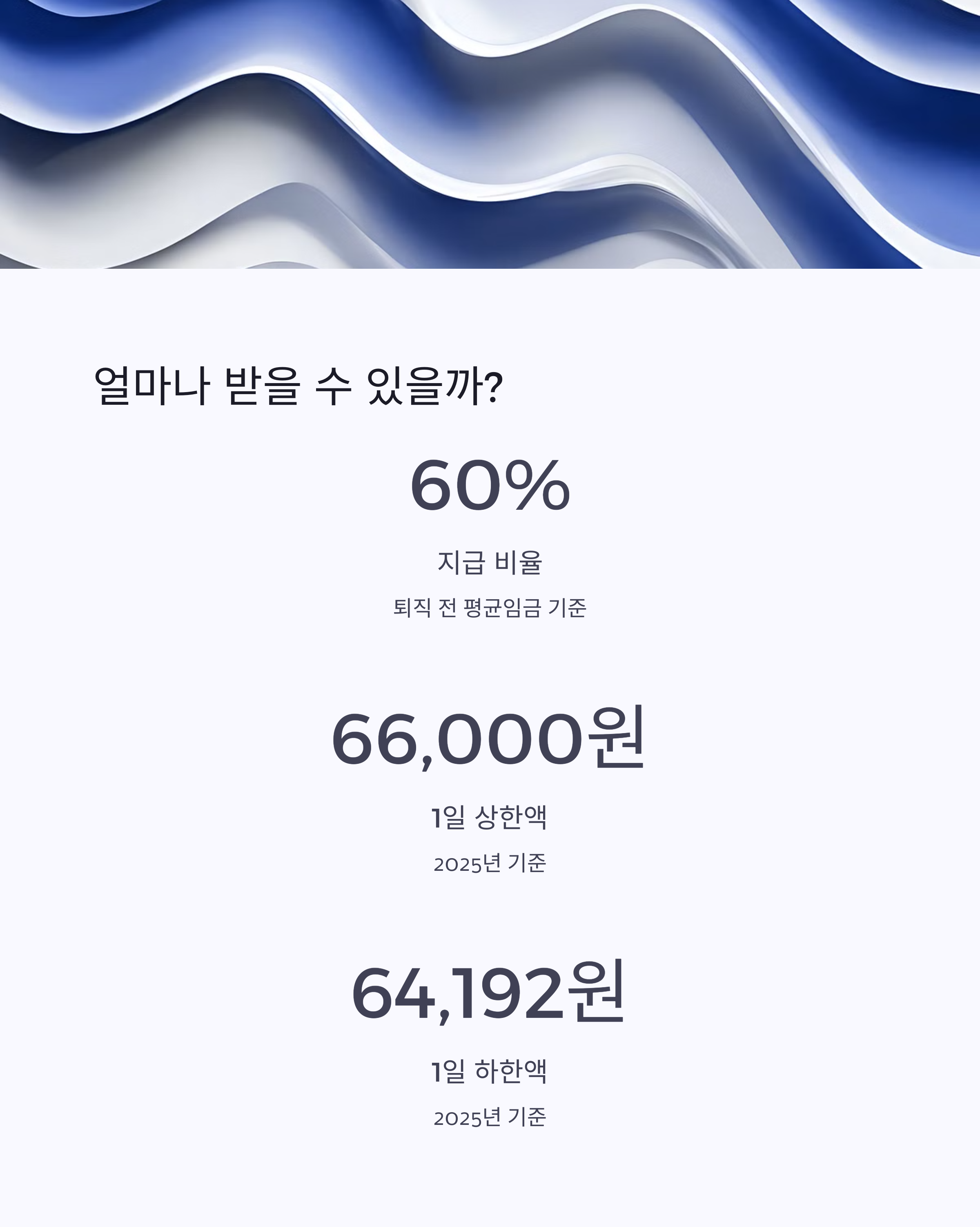 | 평균임금 | 1일 지급액(60%) | 상한/하한 적용 | 총 수급 가능액 (120일 기준) |
