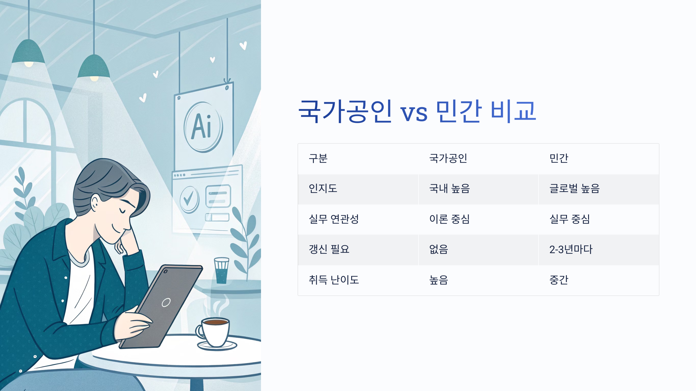국가공인 자격증은 법적 효력과 공신력이 보장돼서 공기업이나 공공기관 취업에 유리한 경우가 많아요. 반면, 민간 자격증은 실무 중심의 커리큘럼을 바탕으로 해외에서도 활용 가능하다는 장점이 있어요.
