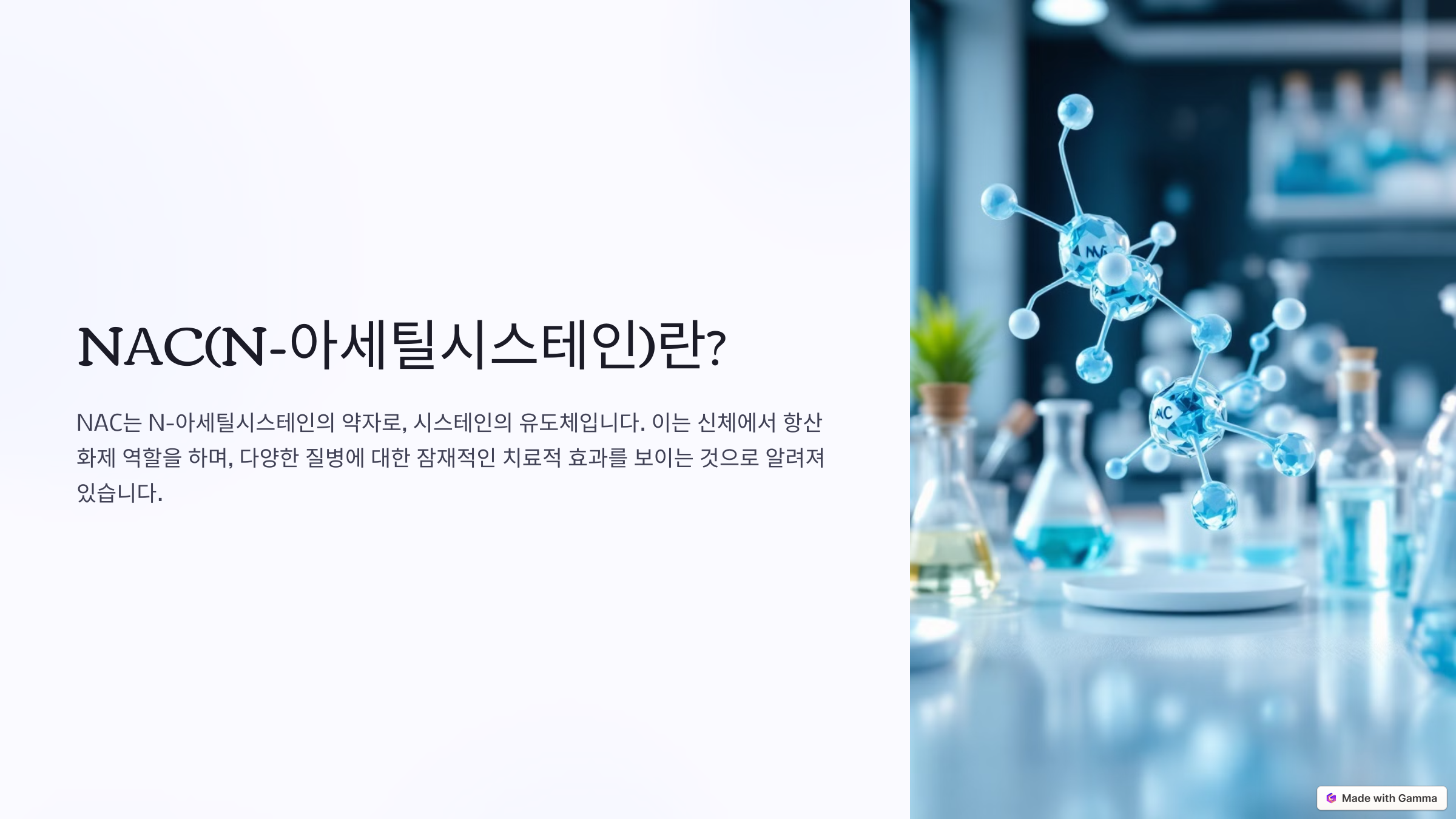 NAC(N-아세틸시스테인)는 필수 아미노산인 시스테인의 변형 형태로, 인체에서 강력한 항산화 물질인 글루타티온(Glutathione)을 생성하는 데 중요한 역할을 해요. NAC는 보충제 형태로 섭취할 수 있으며, 약물이나 환경 독소로부터 신체를 보호하는 데 널리 사용되고 있답니다.